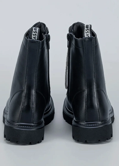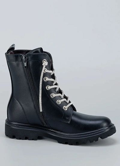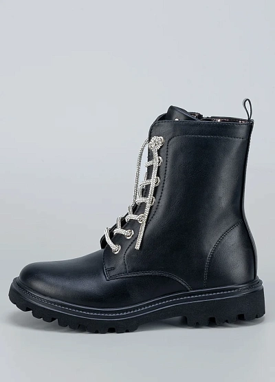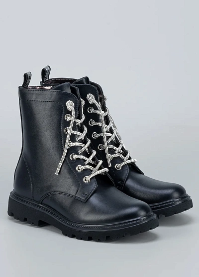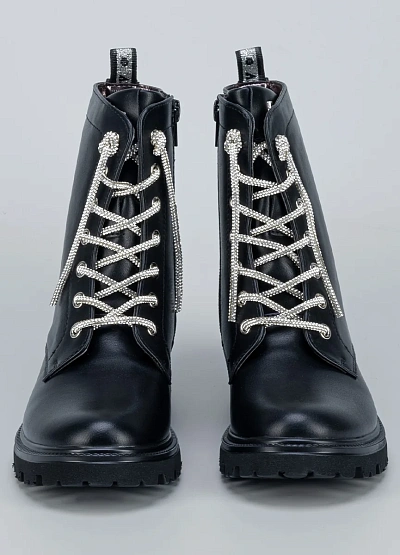• Стильные детские ботинки выполнены из гладкой чёрной экокожи и дополнены блестящими шнурками, которые придают образу оригинальность и яркий акцент.