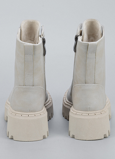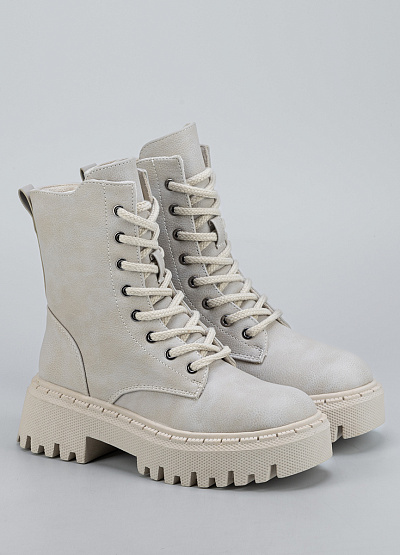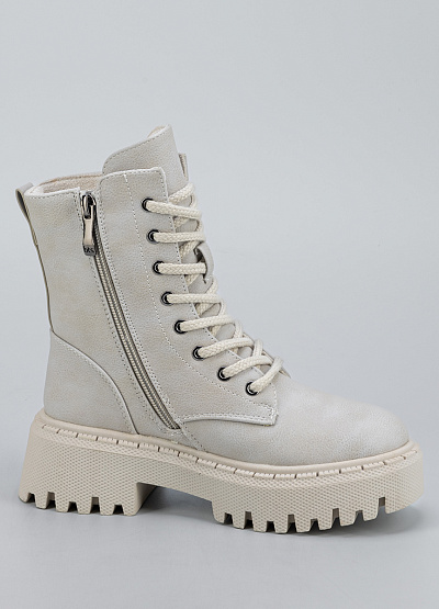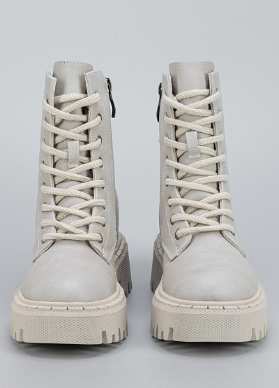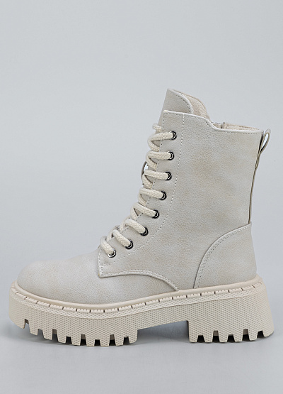 • Женские ботинки в светло-бежевом оттенке — стильная и универсальная модель, сочетающая комфорт и актуальный дизайн. Выполненные из прочного материала с мягкой внутренняя отделкой, они обеспечивают уют и защиту в прохладный сезон. Высокая шнуровка помогает легко регулировать посадку, а массивная тракторная подошва добавляет образу модной дерзости и обеспечивает отличное сцепление с поверхностью.