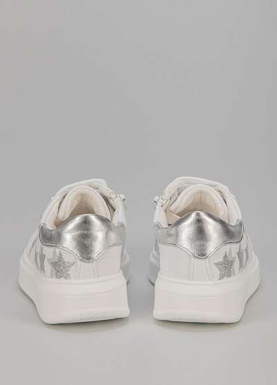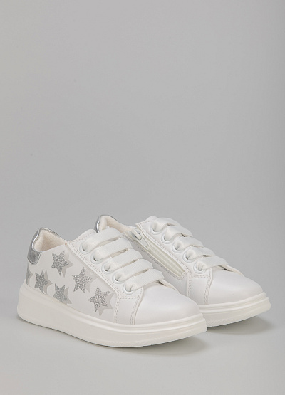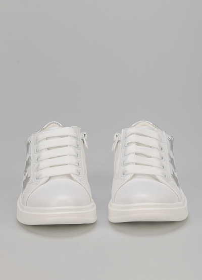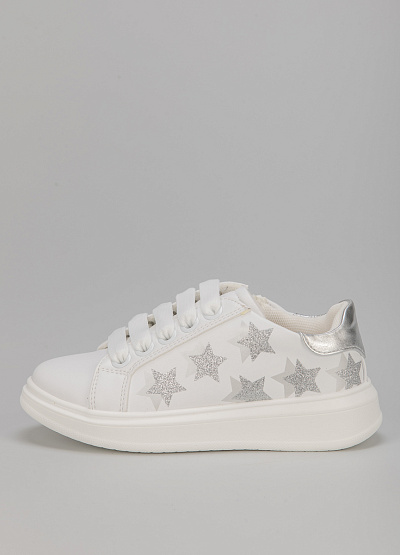 • Детские кеды из экокожи от бренда Asso. Закругленный носок. Открытая шнуровка в тон. Боковой замок на подъеме. Принт в виде звезд. Плоская, широкая подошва.