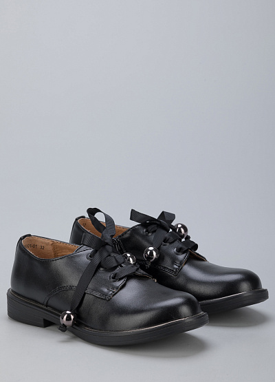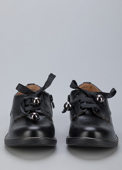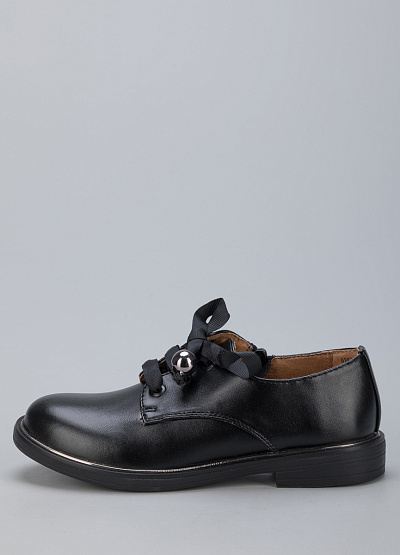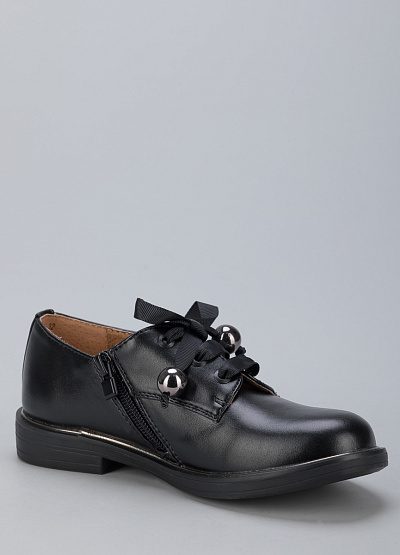 • Детские туфли из экокожи от бренда BETSY. Закругленный носок. Открытая шнуровка в тон в виде ленты с фурнитурой. Боковая молния. Плоская подошва на низком каблуке.