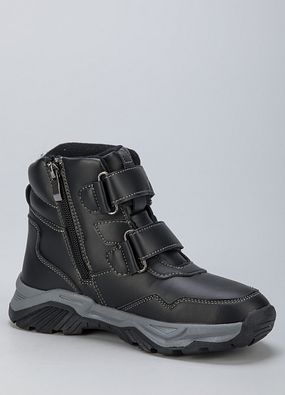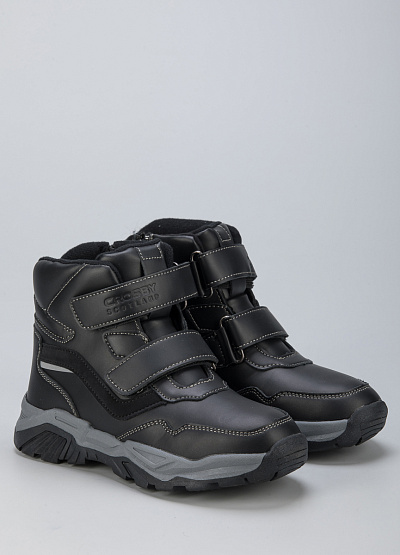 • Детские ботинки из экокожи от бренда CROSBY. Закругленный носок. Две застежки липучки. Тисненый логотип на застежке. Боковая молния. Массивная рифленая подошва.