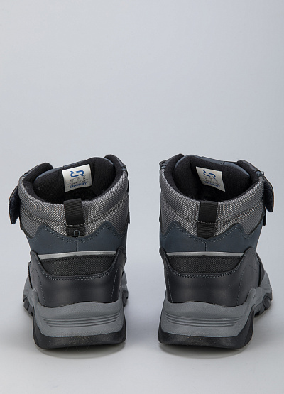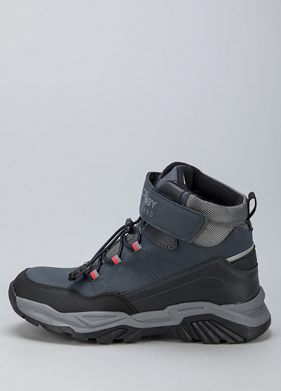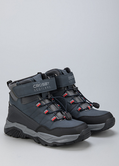 • Детские ботинки из экокожи от бренда CROSBY. Закругленный носок. Открытая шнуровка на кулиске. Застежка-липучка на подъеме. Петли для подтягивания сзади. Массивная рифленая подошва.