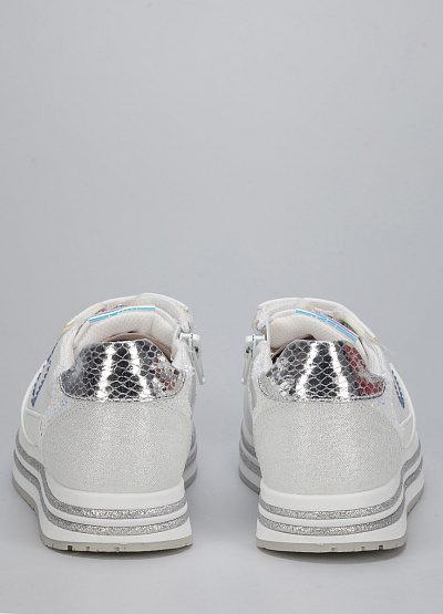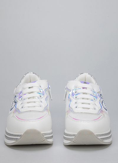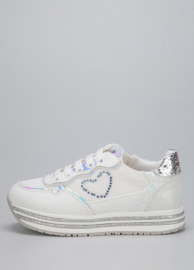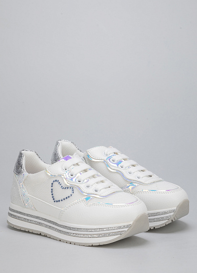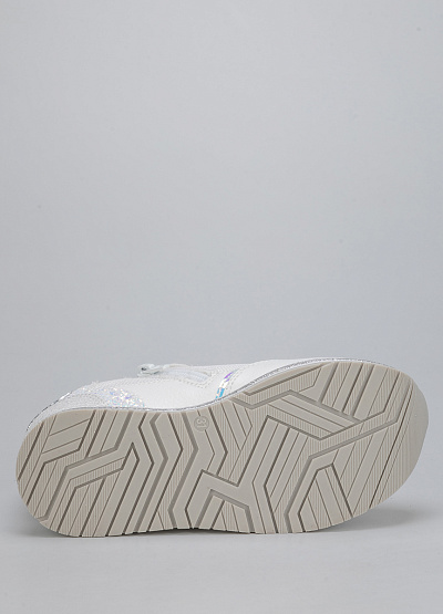 • Детские кроссовки из экокожи от бренда Asso. Закругленный носок. Открытая шнуровка в тон. Боковая молния. Принт из страз сбоку. Широкая рифленая подошва.