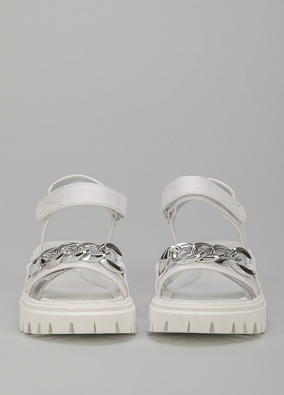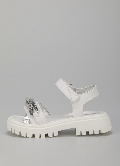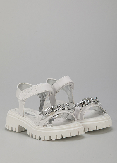 • Детские сандалии из экокожи от бренда Asso. Широкая перемычка декорирована цепью. Застежка-липучка на щиколотке. Массивная рифленая подошва.