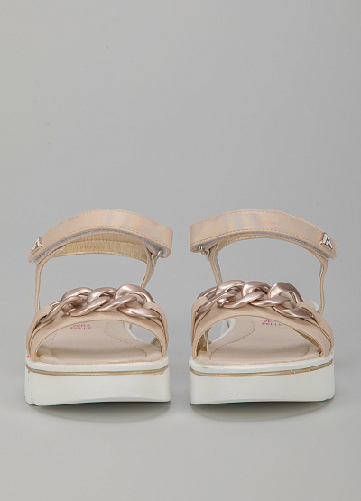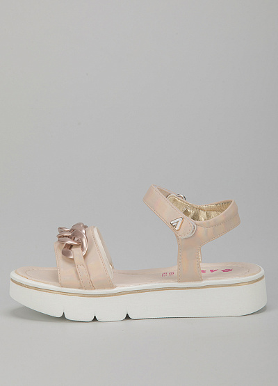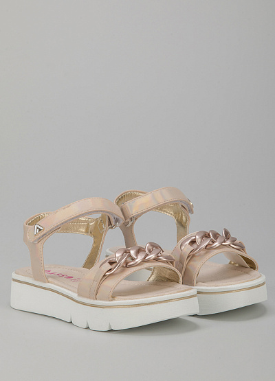 • Детские сандалии из экокожи от бренда Asso. Широкая перемычка декорирована цепью. Застежка-липучка на щиколотке. Плоская рифленая подошва.