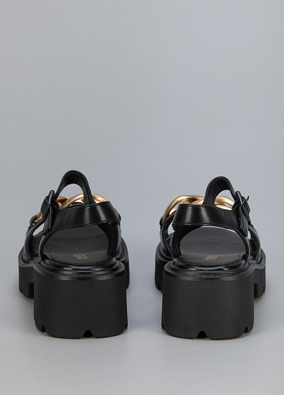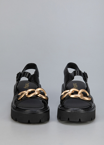• Женские сандалии из экокожи от бренда Keddo. Закругленный носок. Декор в виде цепи сверху. Золотистая фурнитура. Ремешок с застежкой на щиколотке. Широкая рифленая подошва на устойчивом каблуке.