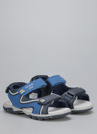 • Детские сандалии из экокожи и текстиля от бренда Thomas Graf. Модель с открытым мысом. Застежка-липучка на двух ремешках и пятке. Плоская рифленая подошва.