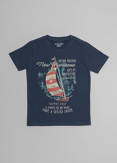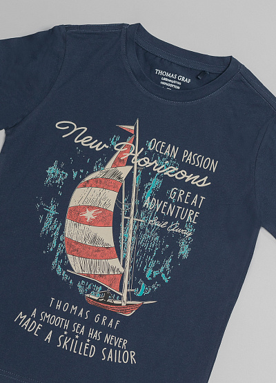 • Детская футболка синего цвета от немецкого бренда Thomas Graf. Модель выполнена из хлопка. Лицевая сторона декорирована крупным принтом. Короткие рукава. Круглый вырез.