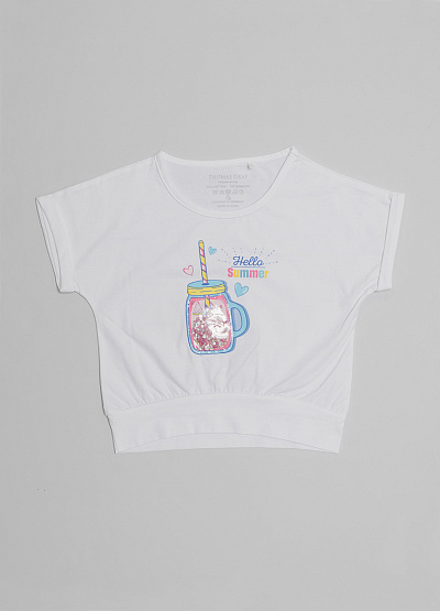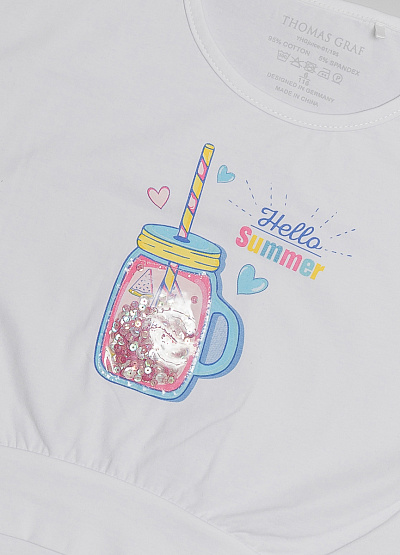 • Детская футболка белого цвета от немецкого бренда Thomas Graf. Модель выполнена из хлопка. Лицевая сторона декорирована принтом. Короткие рукава и низ с окантовкой. Круглый вырез.
