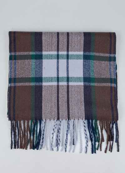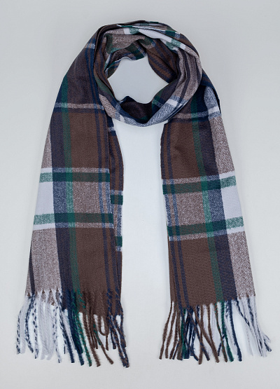 • Уютный шарф в классическую крупную клетку сочетает в себе тёплые коричневые оттенки с глубоким зелёным, синим и белым акцентами. Такое цветовое решение делает аксессуар универсальным — он легко дополняет как повседневные, так и более формальные образы. Мягкая фактура и плотный материал обеспечивают комфорт и защиту в прохладную погоду, а аккуратная бахрома добавляет динамики и завершённости стилю.