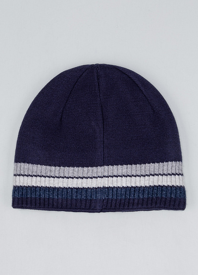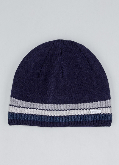 • Мужская вязаная шапка в универсальном стиле с контрастной полосой — практичный аксессуар для холодного сезона. Модель выполнена в тёмно-синем цвете с серо-белыми горизонтальными акцентами, что придаёт образу аккуратный и современный вид. Эластичная вязка обеспечивает комфортную посадку и сохраняет тепло, а лаконичный металлический логотип bugatti подчёркивает фирменный стиль изделия.