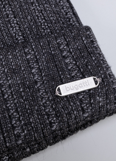 • Мужская шапка темно-серого цвета от бренда Bugatti. Лаконичная модель украшена фурнитурой с логотипом бренда, а также держит форму, мягко облегая голову, защищая от холода и ветра.