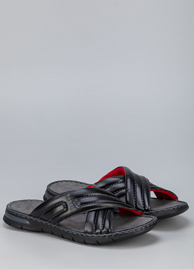 • Мужские шлепки черного цвета из эко кожи от бренда Bugatti. Перекрещивающиеся ремешки, украшенные логотипом создают комфортный образ.