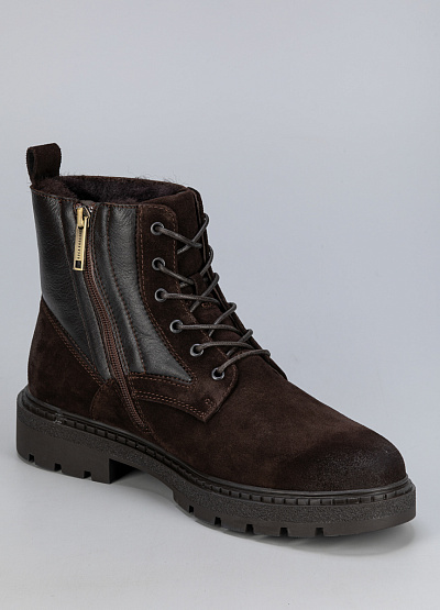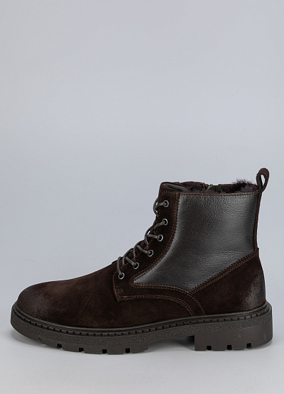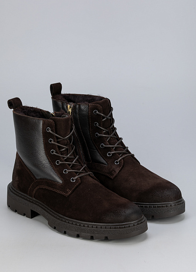 • Мужские зимние ботинки  Duca Daretti выполнены в комбинированном дизайне из плотной тёмно-коричневой замши. Высокая шнуровка обеспечивает надёжную фиксацию стопы, а внутренняя утеплённая отделка создаёт максимальный комфорт в холодную погоду. Массивная протекторная подошва гарантирует устойчивость и уверенное сцепление с поверхностью, делая модель отличным выбором для зимнего сезона.
