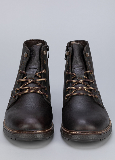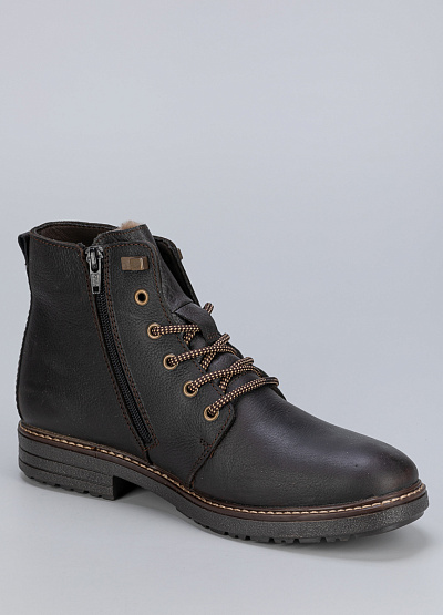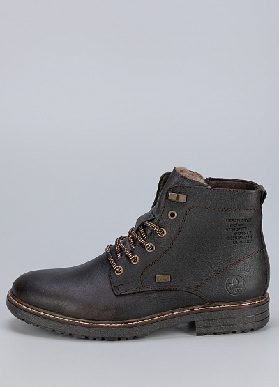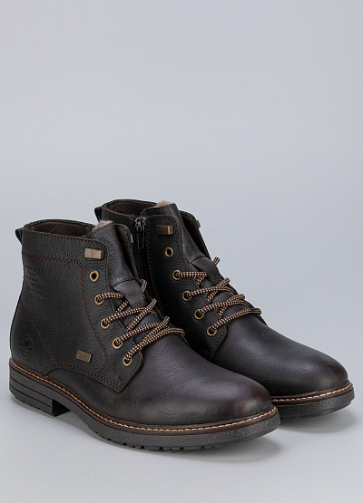 Мужские ботинки коричневого цвета от бренда Rieker из натуральной кожи и экокожи. Модель оснащена застежкой молнией и шнуровкой, что позволяет регулировать полноту обуви и надежно фиксировать стопу. Это удобная обувь, подходящая для повседневной носки.