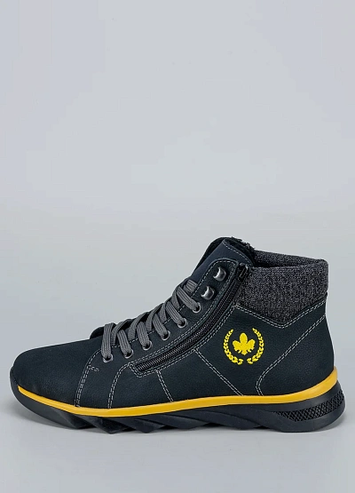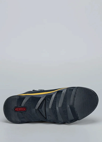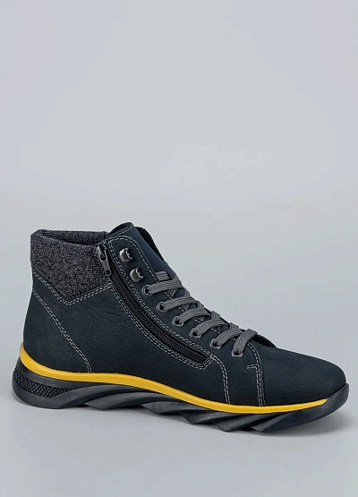 Мужские высокие кеды Rieker — динамичная модель для тех, кто выбирает комфорт и современный стиль. Выполненные в тёмно-синем цвете с контрастными жёлтыми элементами, они привлекают внимание ярким акцентом. Утеплённый текстильный воротник и боковая молния обеспечивают удобство и защиту в прохладную погоду.