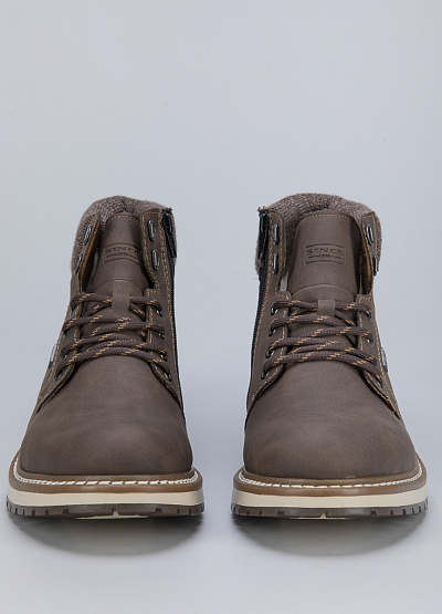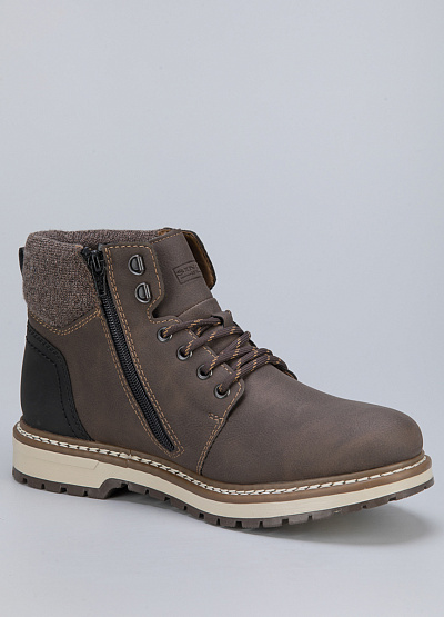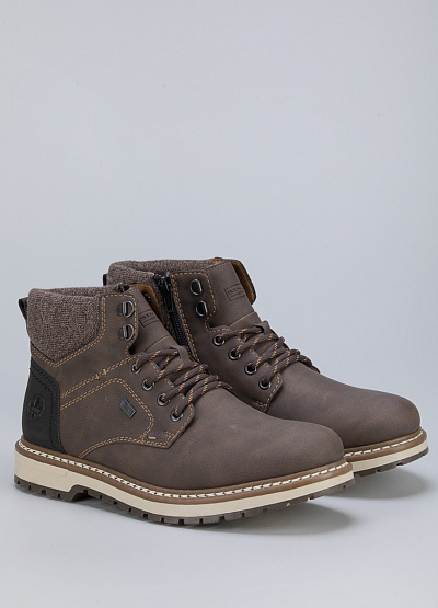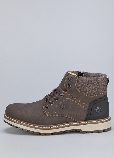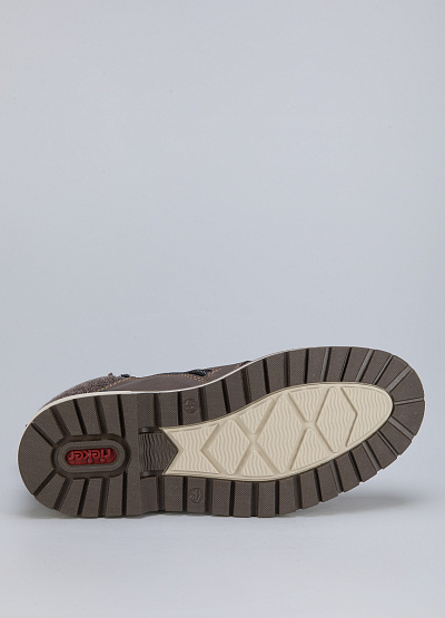 • Мужские ботинки от бренда Rieker. Закругленный носок. Открытая шнуровка в тон. Молния сбоку. Тисненый логотип сбоку. Плоская рифленая подошва.