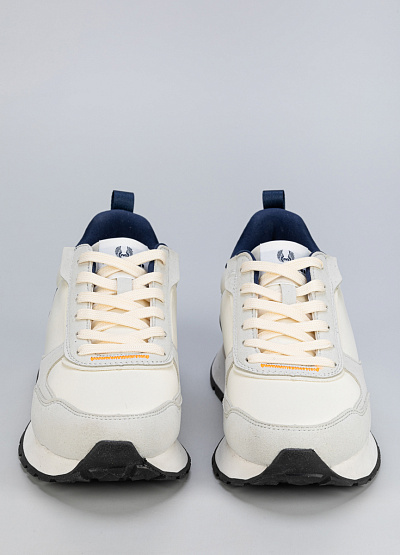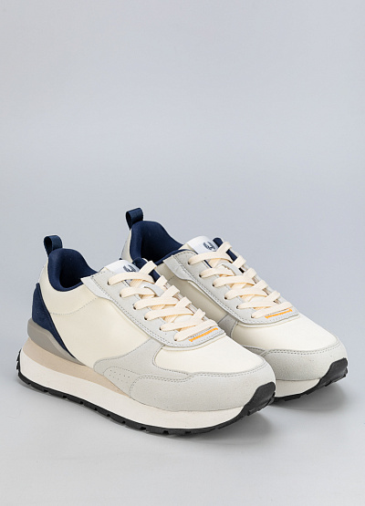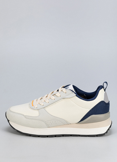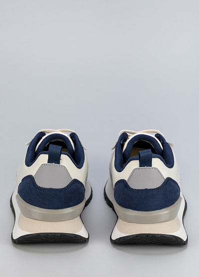 • Мужские кроссовки в молочно-белом цвете с контрастными синими вставками и минималистичным дизайном подойдут для активных и стильных образов. Модель выполнена в ретро-спортивном стиле, сочетающем классику и удобство.