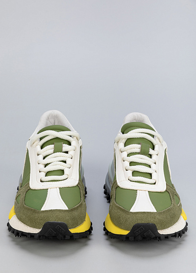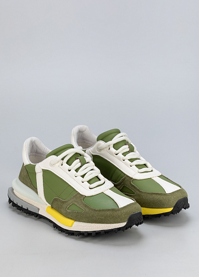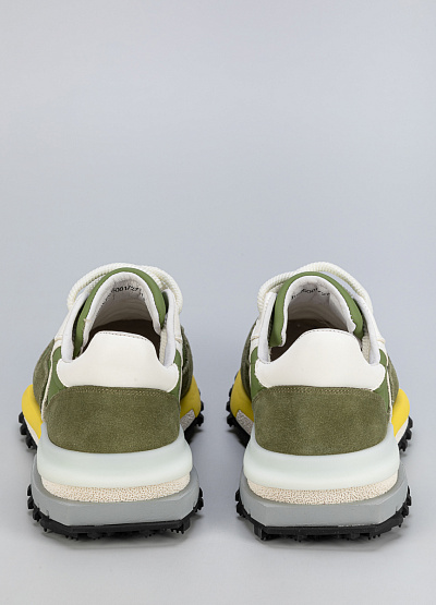 • Мужские кроссовки в зелёном цвете с белыми и жёлтыми акцентами выполнены в ретро-стиле с элементами уличной моды. Контрастные материалы и интересная палитра придают модели свежий и спортивный вид.