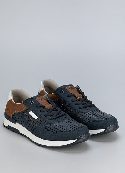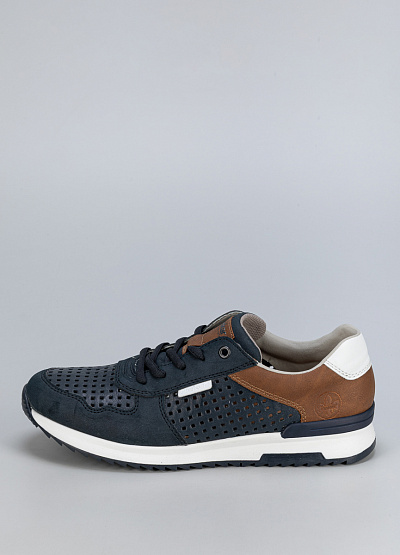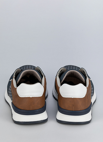 • Мужские тёмно-синие кроссовки с коричневыми вставками — стильный и комфортный вариант для повседневной носки. Детали из экокожи и текстиля обеспечивают надёжность и вентиляцию.