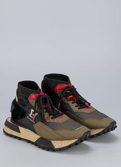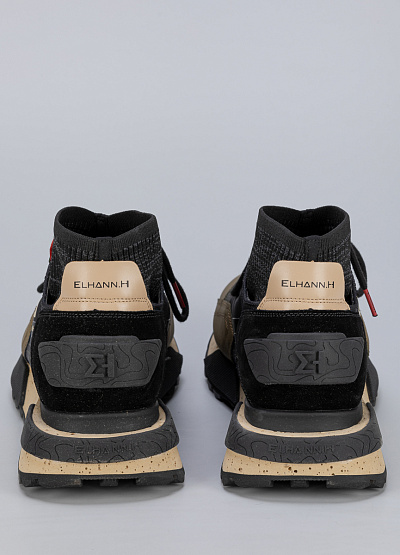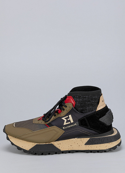 Мужские высокие кеды цвета хаки от бренда Elhann H. Модель имеет особое оформление с широкой подошвой, шнуровкой в тон и высокой голенью. Комфортная шнуровка поможет при надевании. Кеды сочетают в себе функциональность и модные элементы, подчеркивая индивидуальность. Модель идеально подходит для тех, кто ищет обувь, комфортно адаптирующуюся к ноге.