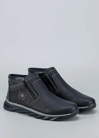 • Удобные мужские сапоги выполнены из прочного чёрной кожи и экокожи с матовой текстурой.