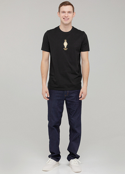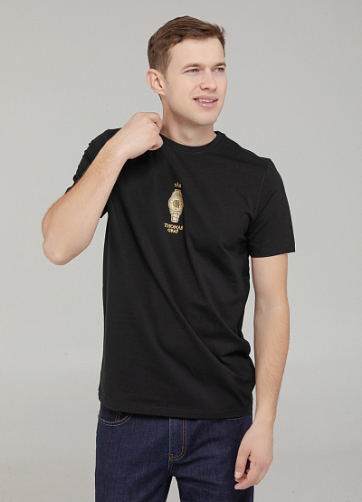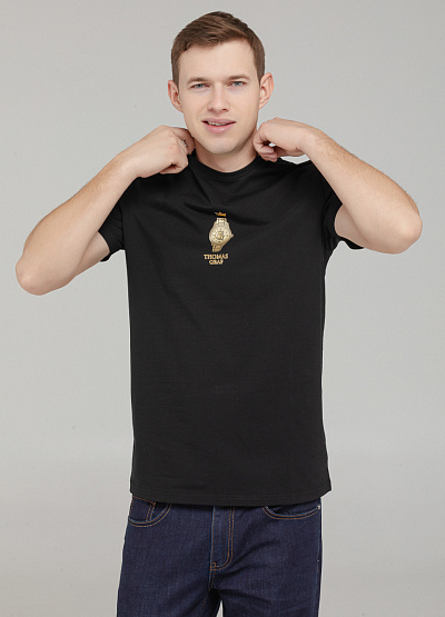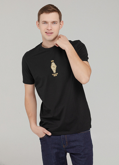 • Мужская чёрная футболка с контрастным принтом — смелый акцент в повседневном гардеробе. Классический крой и мягкий материал обеспечивают комфорт на весь день.