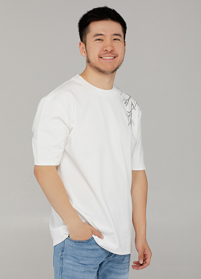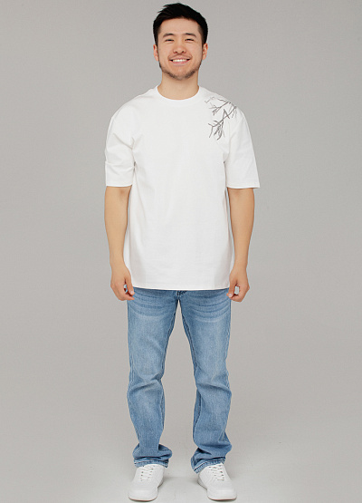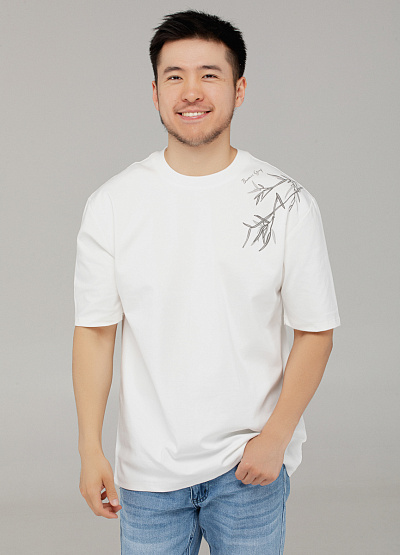 Эта футболка создаёт образ с лёгким восточным акцентом и подчёркнутой аккуратностью. Принт в виде изящной ветки расположен на плече — минимализм, который приковывает взгляд.