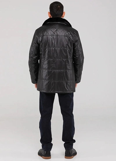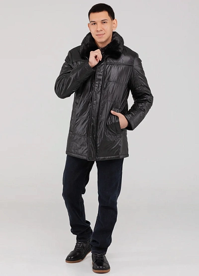 • Элегантная мужская зимняя куртка выполнена в чёрном цвете и дополнена тёплым меховым воротником.