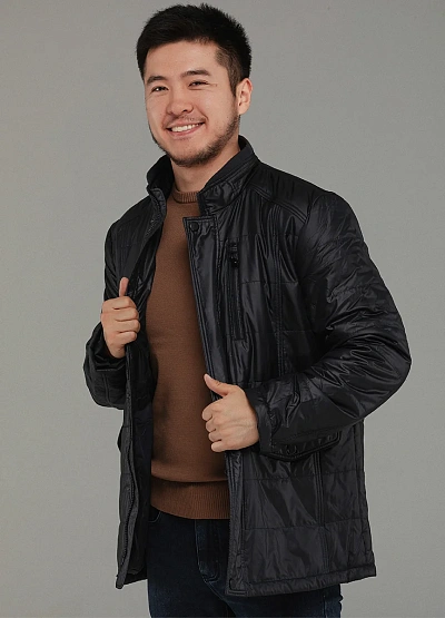 • Мужская стёганая куртка чёрного цвета — практичная и универсальная модель для прохладной погоды. Куртка выполнена в лаконичном дизайне с горизонтальной стёжкой, которая обеспечивает равномерное распределение утеплителя и комфорт при носке. Прямой крой и аккуратный воротник-стойка создают аккуратный силуэт и защищают от ветра. Модель легко вписывается в повседневный гардероб и подходит как для города, так и для поездок.