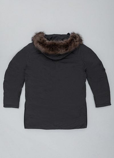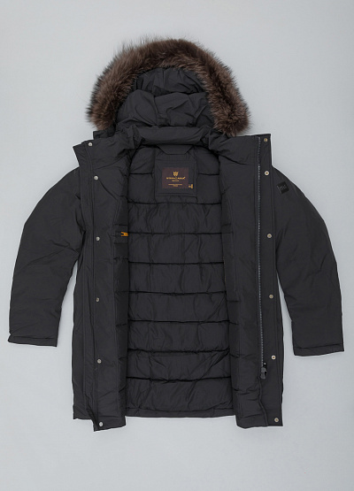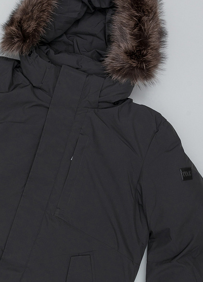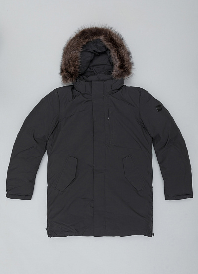• Мужская парка от бренда Vivacana. Модель прямого кроя. Капюшон с мехом. Застежка на молнии и кнопках. Три кармана. Логотип на рукаве.