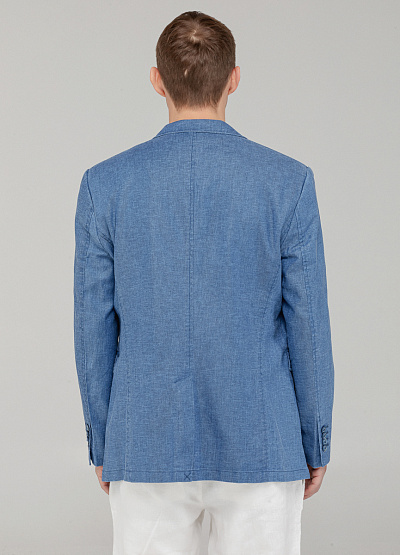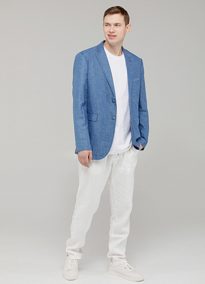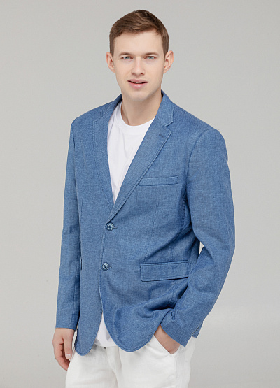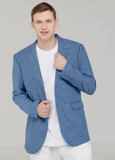 • Мужской льняной пиджак небесно-голубого цвета — лёгкое и элегантное решение для тёплого сезона. Модель в современном стиле дополнена классическим воротником с лацканами и накладными карманами, создавая расслабленный, но собранный образ.