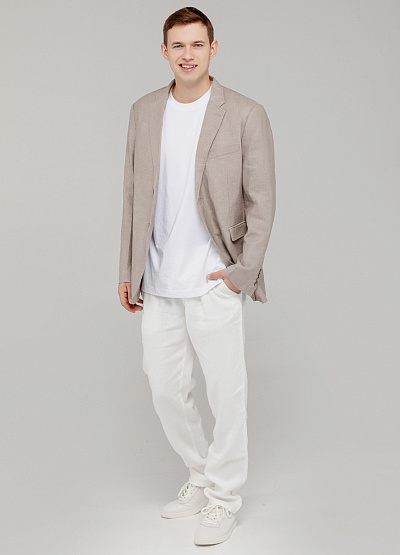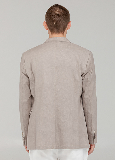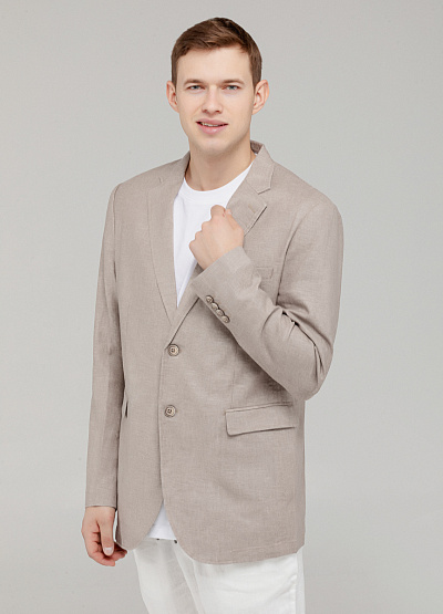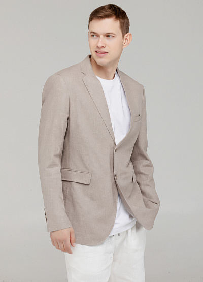 • Мужской льняной пиджак в светло-бежевом оттенке — универсальный элемент гардероба в духе расслабленной элегантности. Лаконичный дизайн с двумя пуговицами, лацканами и прорезными карманами делает его уместным как в повседневных, так и в более формальных образах.
