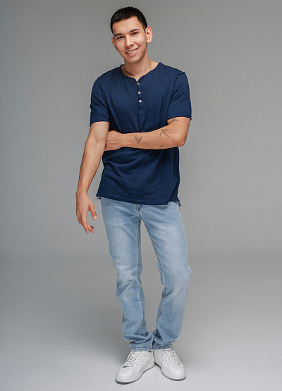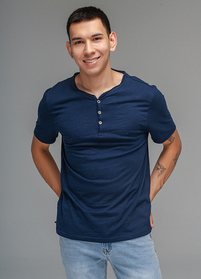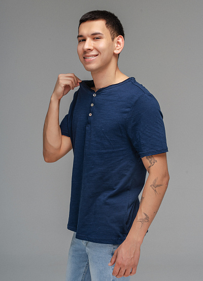 • Мужская футболка темно-синего цвета от бренда Thomas Graf. Модель свободного кроя выполнена из хлопка. Короткие рукава. Круглый вырез с застежкой на пуговицы.