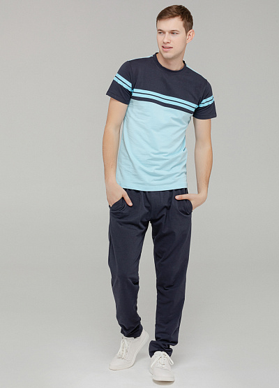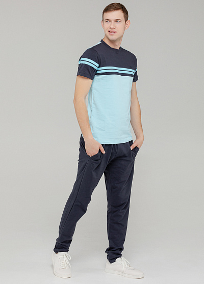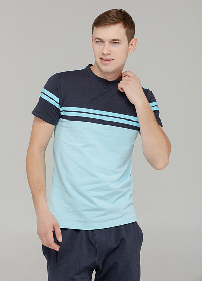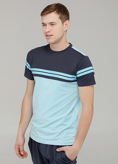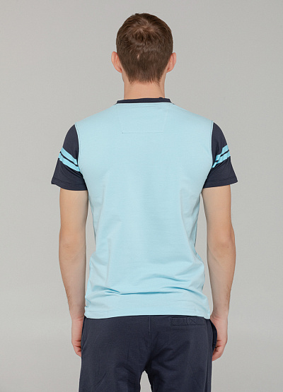 • Современный повседневный стиль в базовом исполнении. Футболка с коротким рукавом выполнена в голубом цвете с акцентными полосками на груди и рукавах. Классический крой и мягкий хлопковый материал обеспечивают комфорт в течение всего дня. Отлично подходит как для прогулок, так и для городской активности. Эффектное, но сдержанное решение для мужского гардероба.