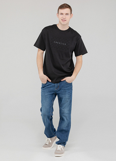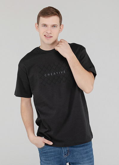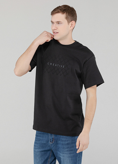 • Стильная мужская футболка из плотного хлопкового трикотажа — идеальный выбор для тех, кто предпочитает минимализм с акцентом. Модель выполнена в классическом чёрном цвете и украшена объёмным геометрическим принтом с надписью CREATIVE на груди. Благодаря прямому крою и удобной посадке, футболка отлично подойдёт для повседневной носки, прогулок, встреч с друзьями и создания городских образов.