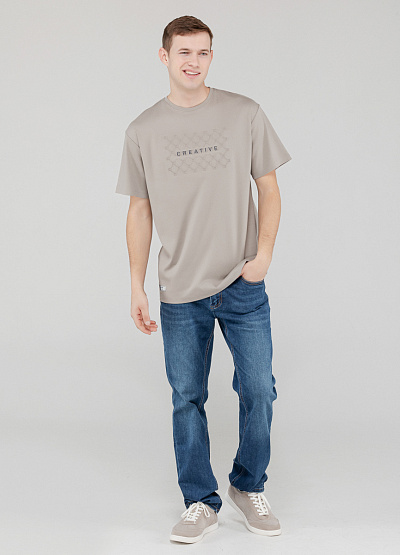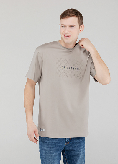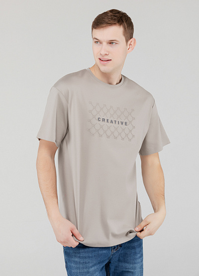 • Стильная мужская футболка из плотного хлопкового трикотажа — идеальный выбор для тех, кто предпочитает минимализм с акцентом. Модель выполнена в классическом бежевом цвете и украшена объёмным геометрическим принтом с надписью CREATIVE на груди. Благодаря прямому крою и удобной посадке, футболка отлично подойдёт для повседневной носки, прогулок, встреч с друзьями и создания городских образов.