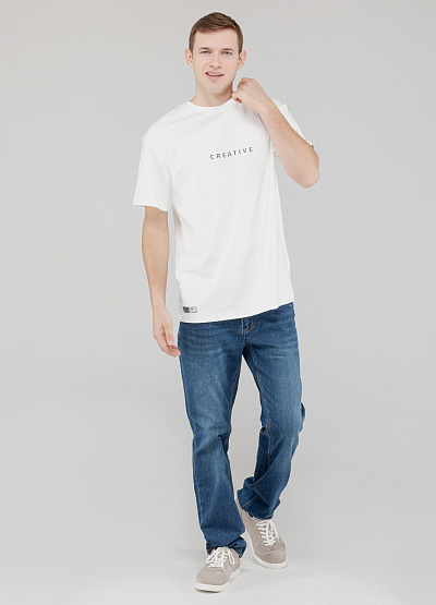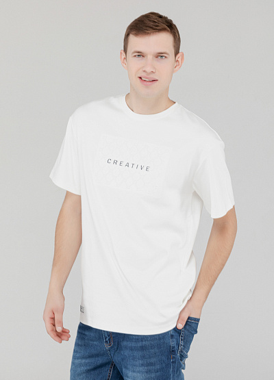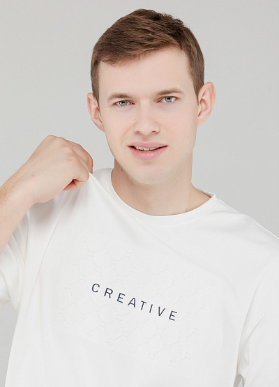 • Современная мужская футболка белого цвета прямого кроя из плотного хлопкового материала — универсальная и стильная основа для повседневного гардероба. Модель оформлена объёмным тиснением с геометрическим узором и надписью CREATIVE на груди, что добавляет индивидуальности и делает образ выразительным. Классический круглый вырез и короткие рукава обеспечивают комфорт и свободу движений.