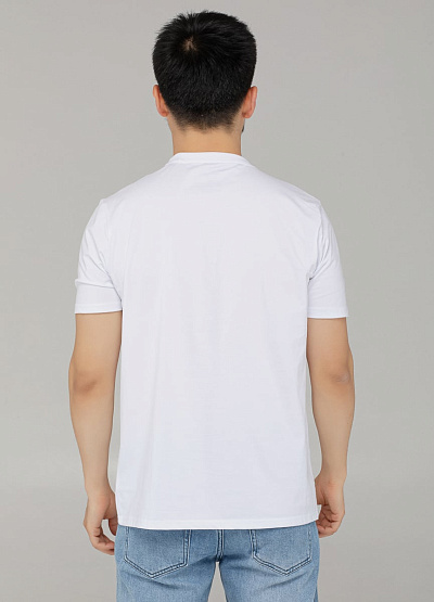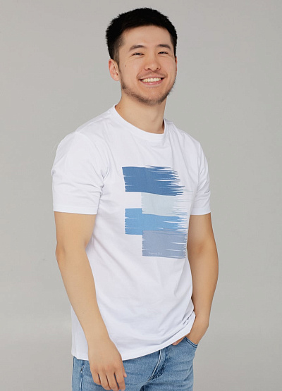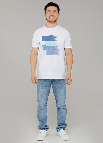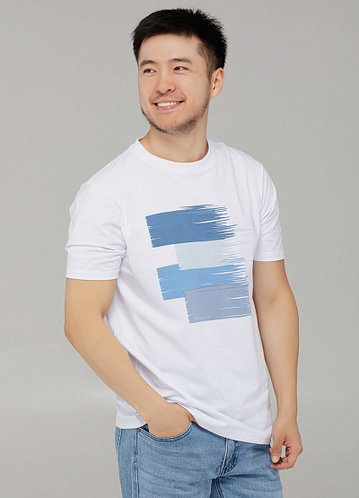 • Мужская футболка с абстрактным принтом в оттенках синего — стильное решение для тех, кто ценит простоту с характером. Белый фон подчёркивает геометрию рисунка и придаёт образу свежесть.