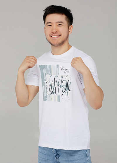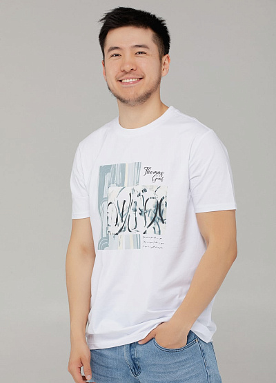 • Белая мужская футболка с абстрактным арт-принтом в холодных оттенках — выбор для тех, кто ценит нестандартный стиль. Дизайн дополнен тонкой надписью Thomas Graf, придающей модели художественную глубину.