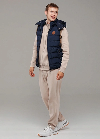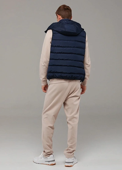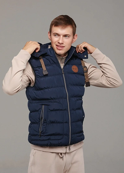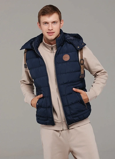 • Стильный мужской жилет выполнен в тёмно-синем цвете из прочного материала с утеплителем.