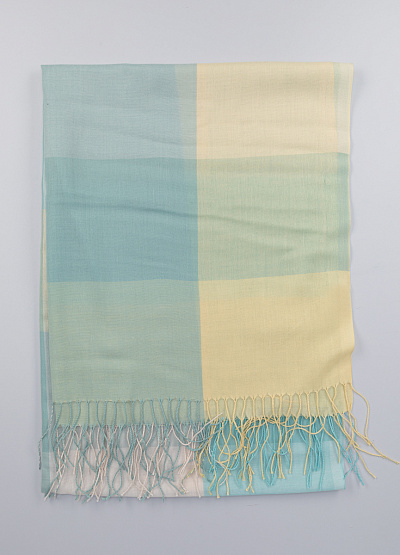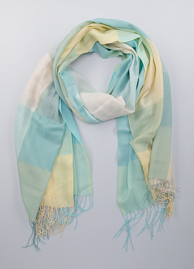 • Женский шарф желто-ментолового цвета от бренда BB Accessories. Модель выполнена из легкой ткани. Украшен бахромой по краям. Это не только аксессуар, но и полезная вещь, особенно в прохладное времена года. Они помогают защитить от холода и ветра, а также могут быть стильным дополнением к вашей одежде.