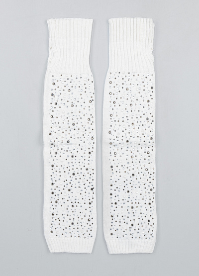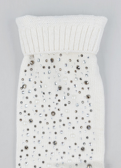 • Элегантные белые удлинённые митенки (перчатки без пальцев), украшенные густой россыпью блестящих страз, создают яркий и нарядный акцент в зимнем образе. Мягкая эластичная вязка комфортно прилегает к руке, обеспечивая тепло и свободу движений. Благодаря удлинённой форме митенки закрывают кисть и часть предплечья, сочетая практичность с эффектным дизайном. Стразы разных размеров добавляют аксессуару сияние и выразительность.