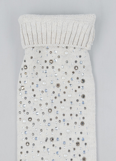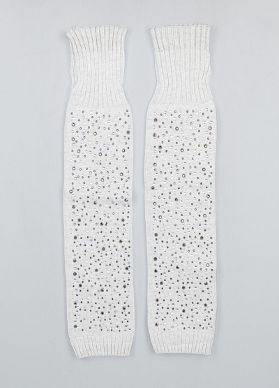 • Теплые вязаные перчатки в белом цвете, украшенные россыпью блестящих страз, станут стильным и уютным аксессуаром для холодного сезона. Удлинённая форма закрывает кисть и часть предплечья, обеспечивая дополнительное тепло, а эластичная вязка комфортно облегает руку. Стразы разных размеров создают яркий, нарядный эффект, который отлично дополняет зимние образы.