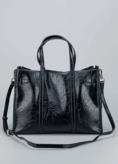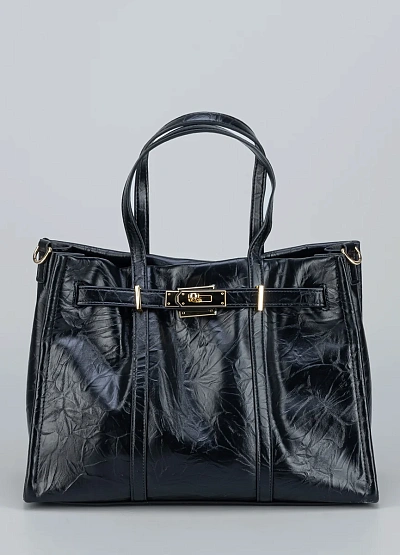 • Компактная сумка Loretta Very строгой формы из глянцевой черной экокожи с фактурной поверхностью и легким блеском. Основное украшение — ремешок с золотистой фурнитурой и декоративным замком, придающим образу элегантность. Идеальный вариант для делового стиля или повседневного выхода.
