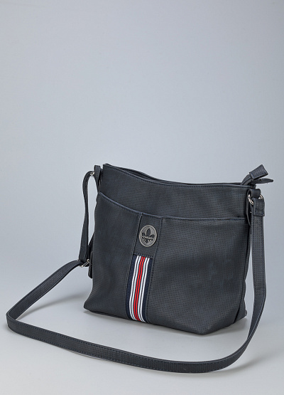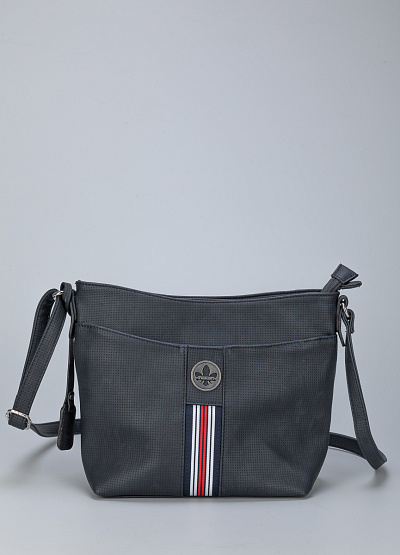 • Сумка из экокожи от бренда Rieker. Застежка на молнии. Лицевая часть украшена логотипом и контрастной полоской. Карман-молния на задней части. Ремень на плечо с регулировкой длины в комплекте. Серебряная фурнитура.