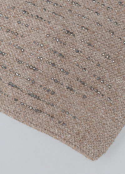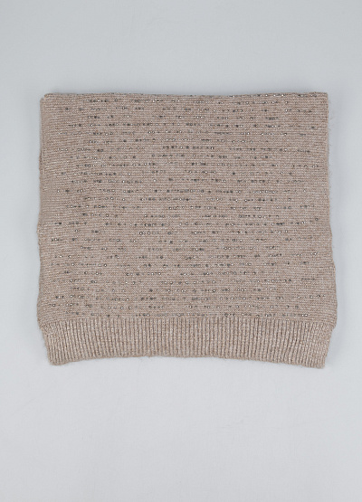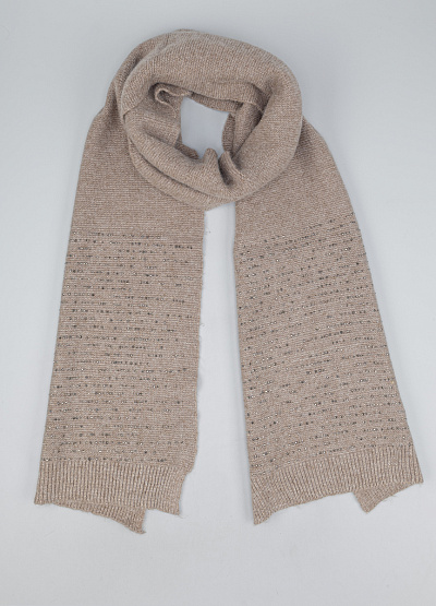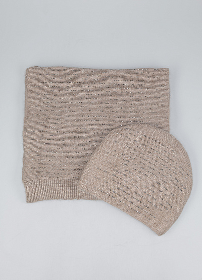 • Стильный женский зимний комплект ― шапка и шарф-снуд ― выполнен в спокойном бежево-песочном оттенке и украшен мелкими блестящими стразами. Мягкая вязаная ткань обеспечивает приятные тактильные ощущения и отличное удержание тепла, оставаясь комфортной даже при длительной носке. Шапка аккуратно облегает голову, а объемный снуд легко драпируется и надежно защищает шею от ветра. Нежное мерцание декора делает комплект универсальным и элегантным аксессуаром.