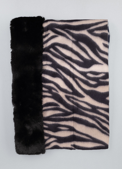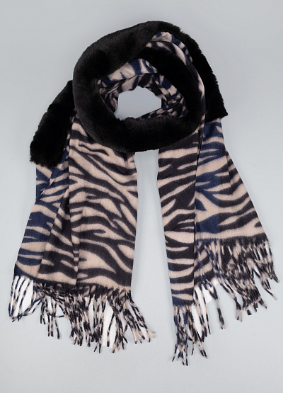 • Эффектный зимний шарф с анималистичным рисунком — стильный аксессуар, который сочетает в себе тепло, комфорт и выразительный дизайн. Мягкая ткань в узоре «зебра» выполнена в нюдово-темной гамме, а широкий бордюр из искусственного меха добавляет шарфу роскошный и уютный акцент. Модель легко драпируется, надежно защищает от холода и становится яркой деталью любого образа. Кисточки по краям завершают динамичный и модный стиль изделия.