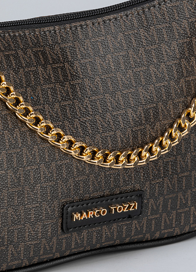 • Женская сумка коричневого цвета от бренда Marco Tozzi. Элегантная модель из экокожи - идеальный выбор для ваших повседневных дел. Модель с регулируемым ремнем обеспечивает комфорт и красоту за счет золотистой цепочки. Форма багета, которая в сочетании с принтом делает ее уникальной. Несмотря на свой компактный размер, она удивительно вместительна. В ней предусмотрены различные карманы и отделения для размещения всех необходимых вещей, включая телефон, кошелек и косметику.