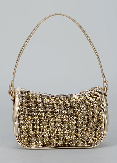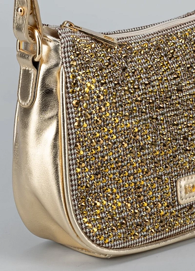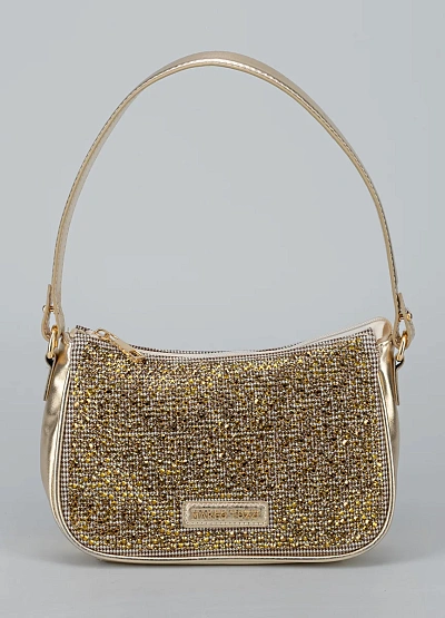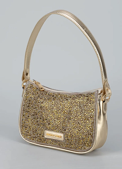 • Эта мини-сумка в золотистом оттенке — настоящий акцент любого образа. Усыпанные сияющими стразами панели создают эффект «жидкого металла», ловя каждый луч света. Компактная форма baguette делает модель стильной, а удобная ручка позволяет носить сумку и на плече, и в руке.